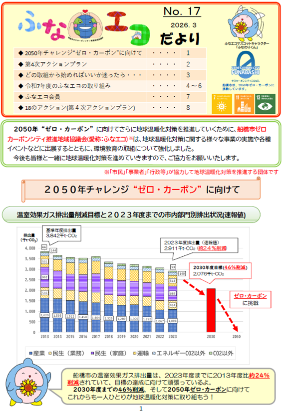 令和7年度に実施した取り組みのほか、2050年チャレンジ”ゼロカーボン”に向けての船橋市の温室効果ガス排出状況や身近にできる地球温暖化対策の具体例を紹介しているので、ぜひご覧ください。